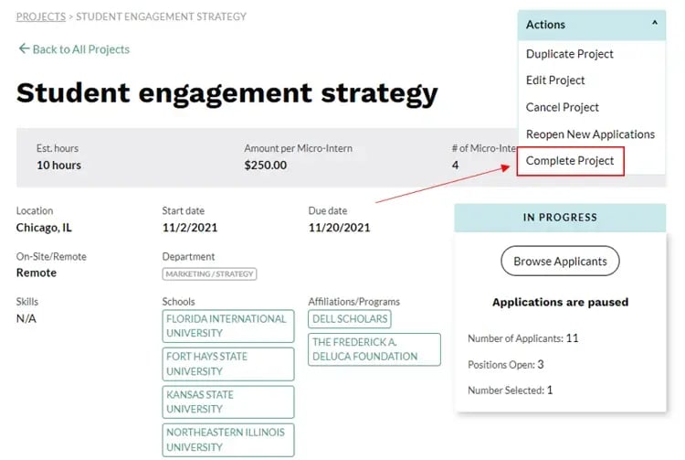 Click on your project under IN PROGRESS and then select COMPLETE PROJECT under the ACTIONS dropdown menu. If you do not complete this step, Parker Dewey will not add your Contractors to the payroll for that month.