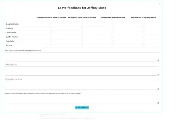 Parker Dewey provides words of feedback for your contractor including "Expect More from an Intern or New Hire" and "Executed like an Industry Veteran". The feedback function allows you to provide your own comments to the contractor. You can also provide classified comments sent only to Parker Dewey about the contractor that will not be released to the contractor.